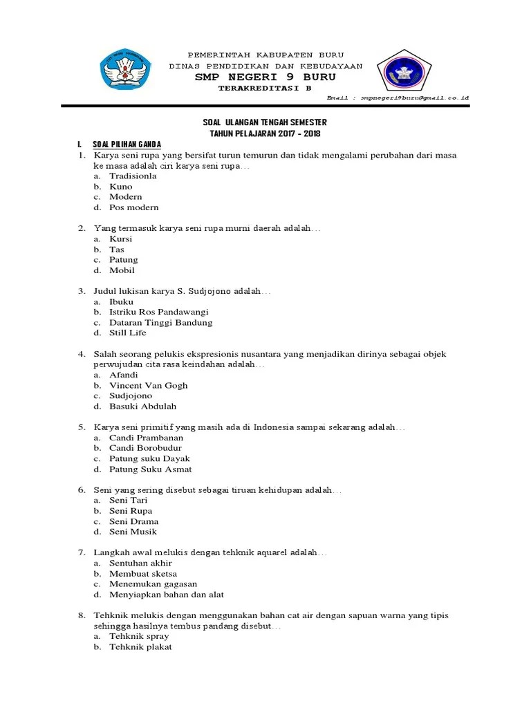 Contoh Soal Pilihan Ganda Bab Seni Rupa / Soal Soal Tentang Seni Cabdi Beserta Jawaban Revisi Id : Seperti yang kita ketahui, bahwa pelajaran seni budaya yang ada di smp/mts dan sma/ smk terbagi menjadi beberapa materi, yaitu seni musik, seni tari, seni rupa, dan seni teater.