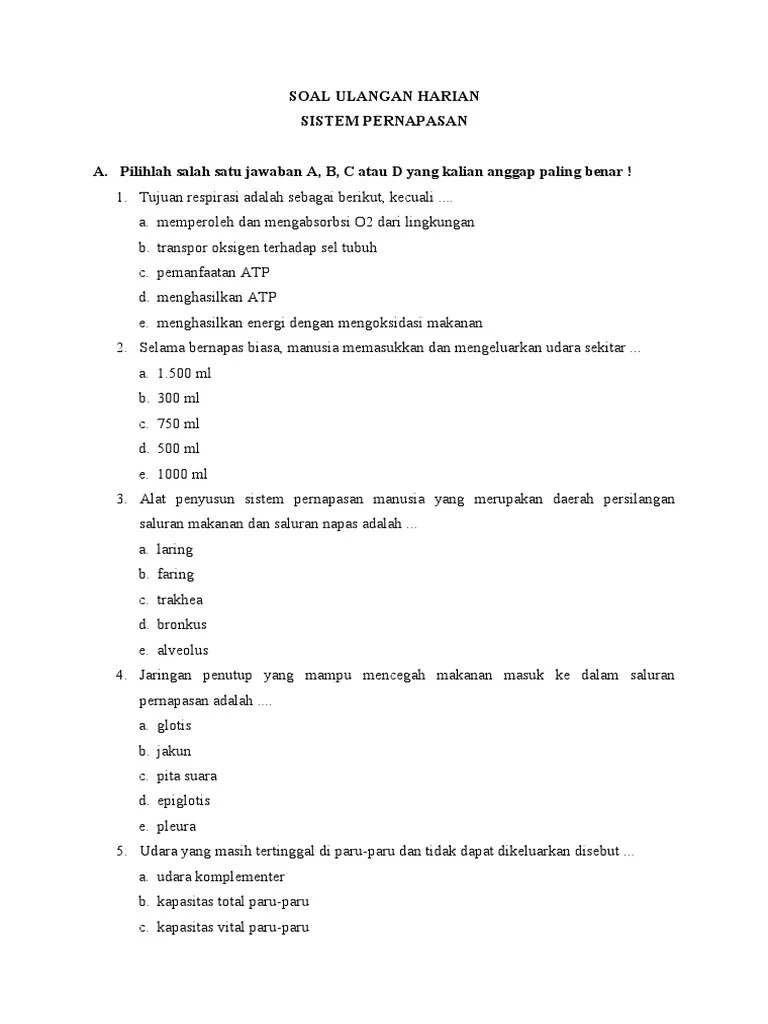 Ikuti penjabaran dan contoh soal yang menarik ini untuk lebih mengerti lagi . Urutan saluran pernapasan dari luar ke dalam adalah : Sistem pernapasan pada manusia disusun oleh beberapa organ, bagian yang paling efektif untuk terjadi difusi oksigen dan karbon dioksida adalah … Kunci jawaban di bawah soal. Contoh latiihan soal sistem pernapasan manusia ini berbentuk pilihan ganda dengan jumlah 15 butir soal dan dilengkapi dengan kunci jawaban.